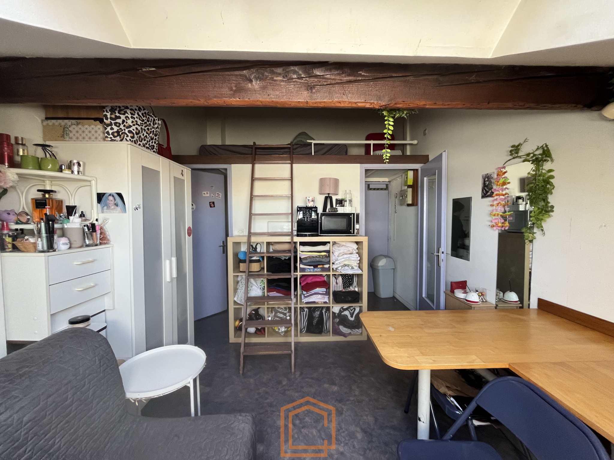 Ce studio séduit par son grand vélux offrant une vue dégagée sur les toits, baignant la pièce de lumière. Il comprend une entrée-coin cuisine, une pièce de vie avec mezzanine ainsi qu'une salle d'eau avec wc.