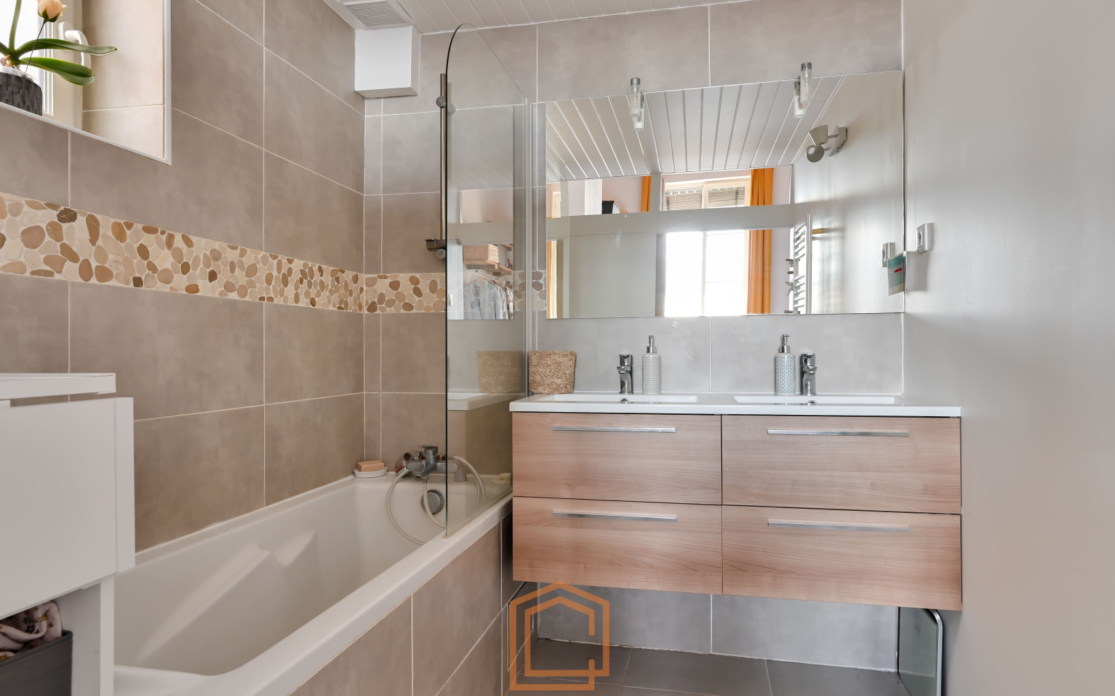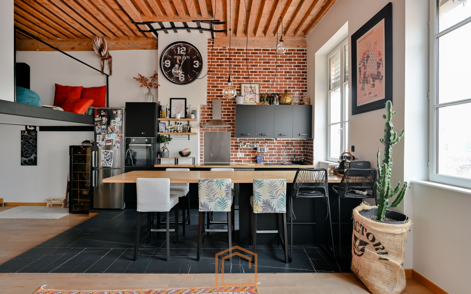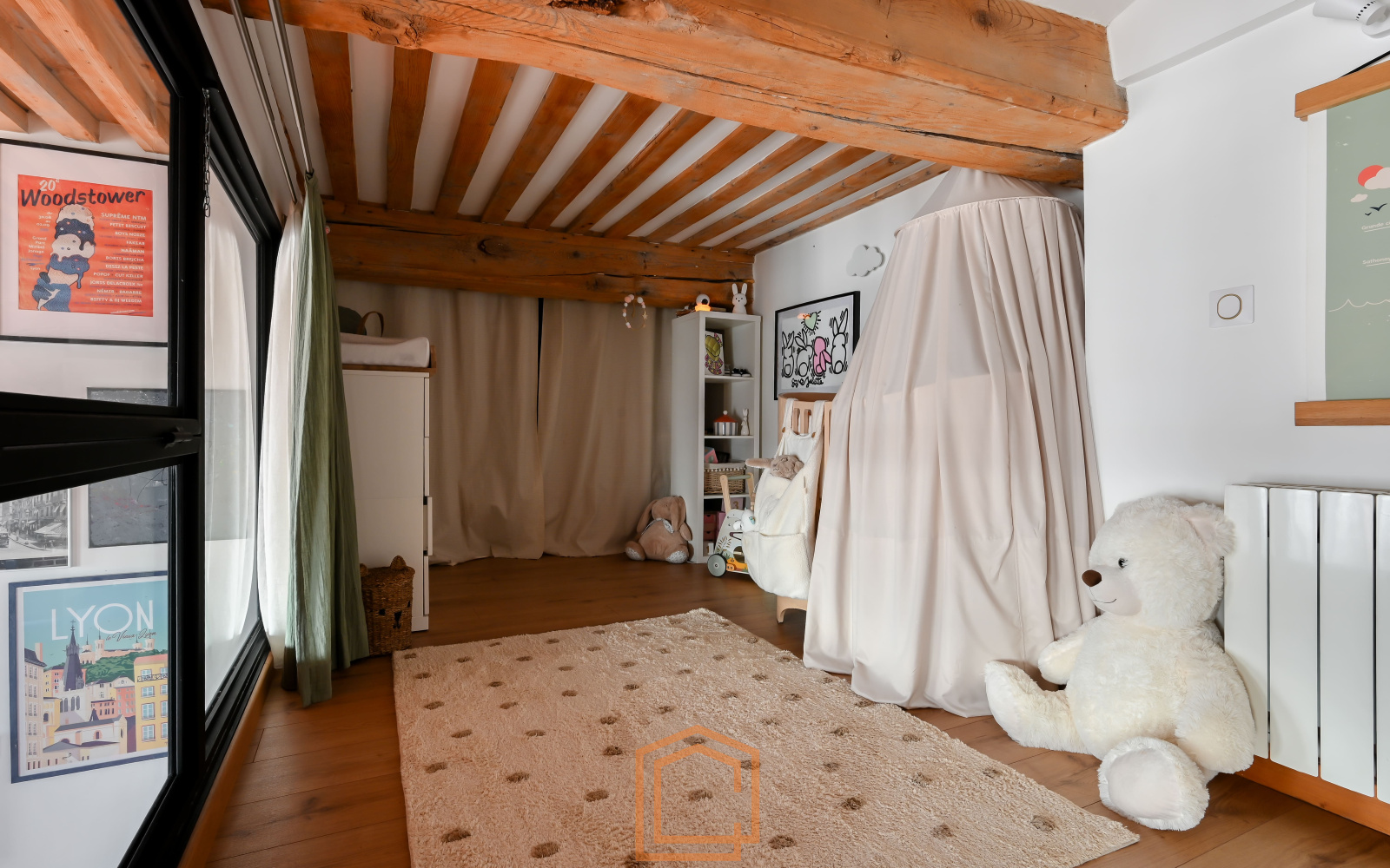 À l’étage, une seconde chambre lumineuse, mise en valeur par une grande verrière avec fenêtre, s’accompagne d’un espace bureau et de nombreux rangements, offrant un cadre idéal pour le télétravail ou une chambre d’appoint.