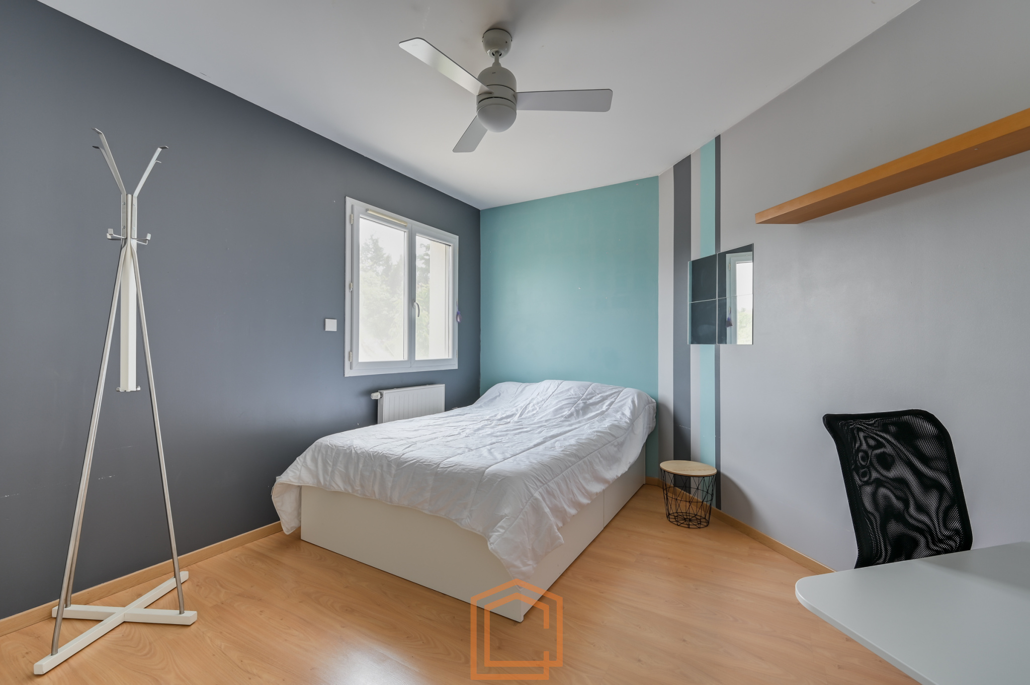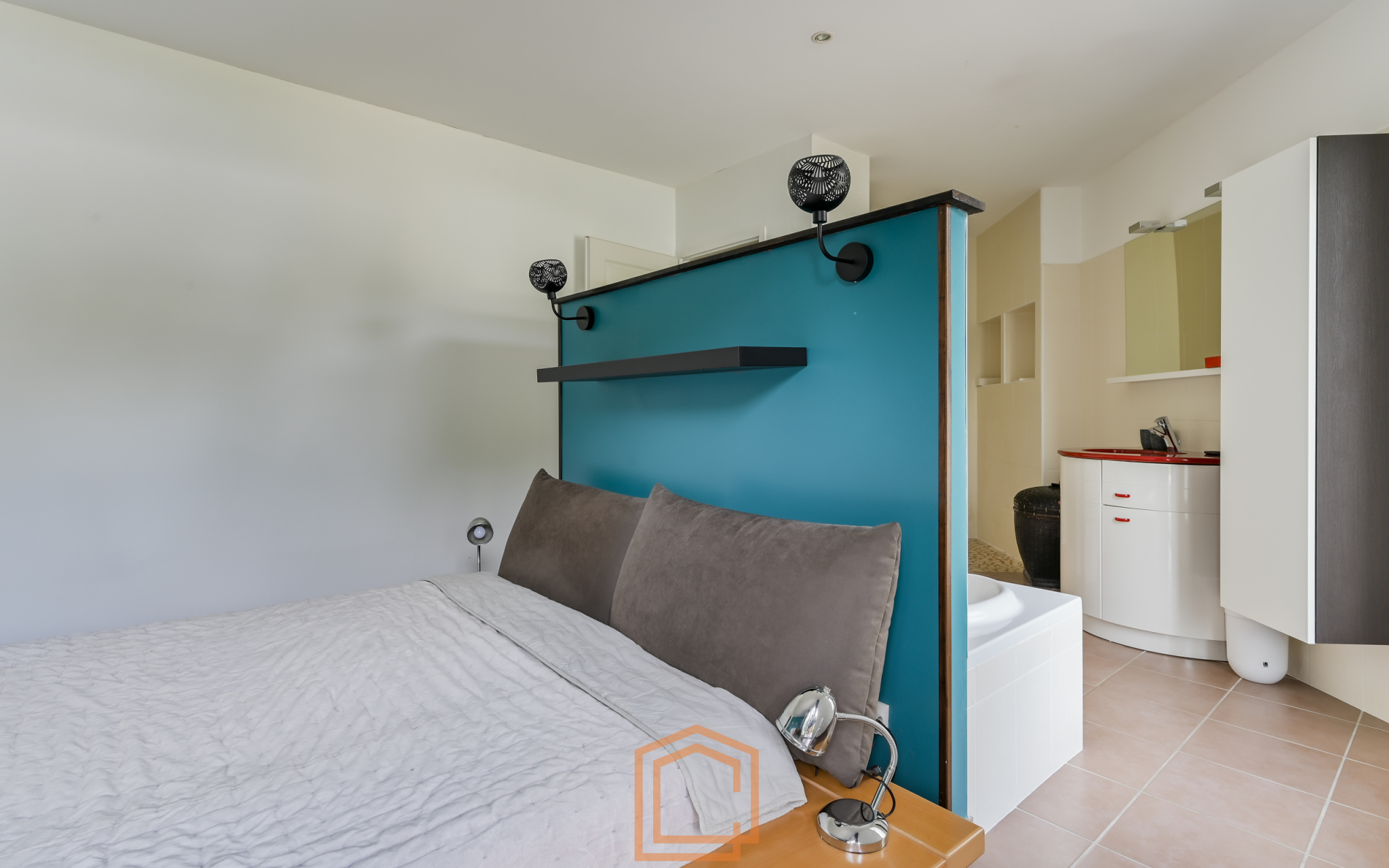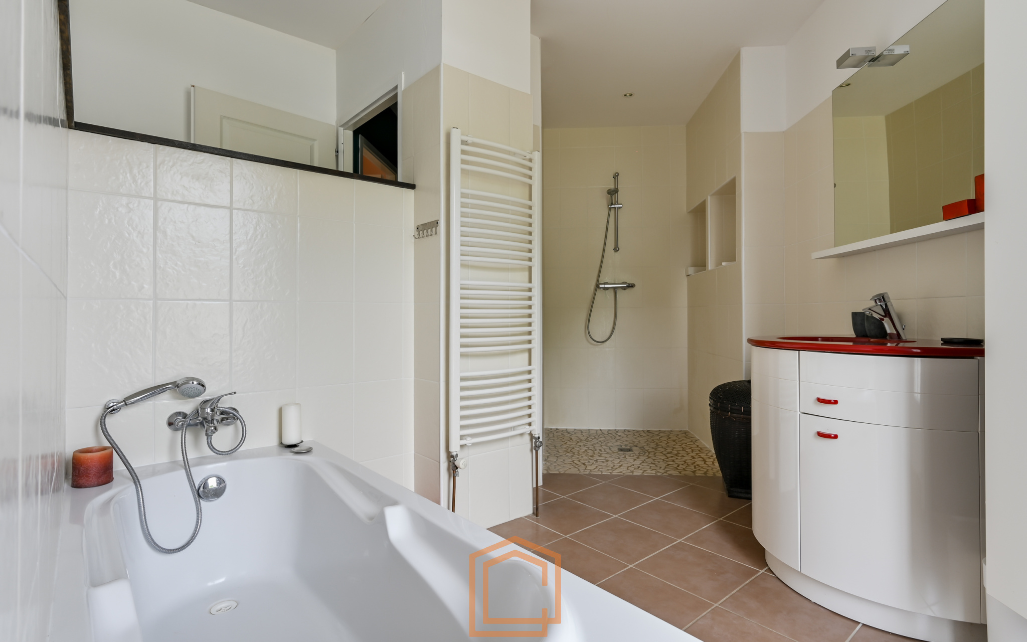 De plein pied, vous trouverez une suite parentale ouvrant sur le jardin avec salle de bains (douche et baignoire), ainsi qu’un dressing aménagé de 4,70 m².